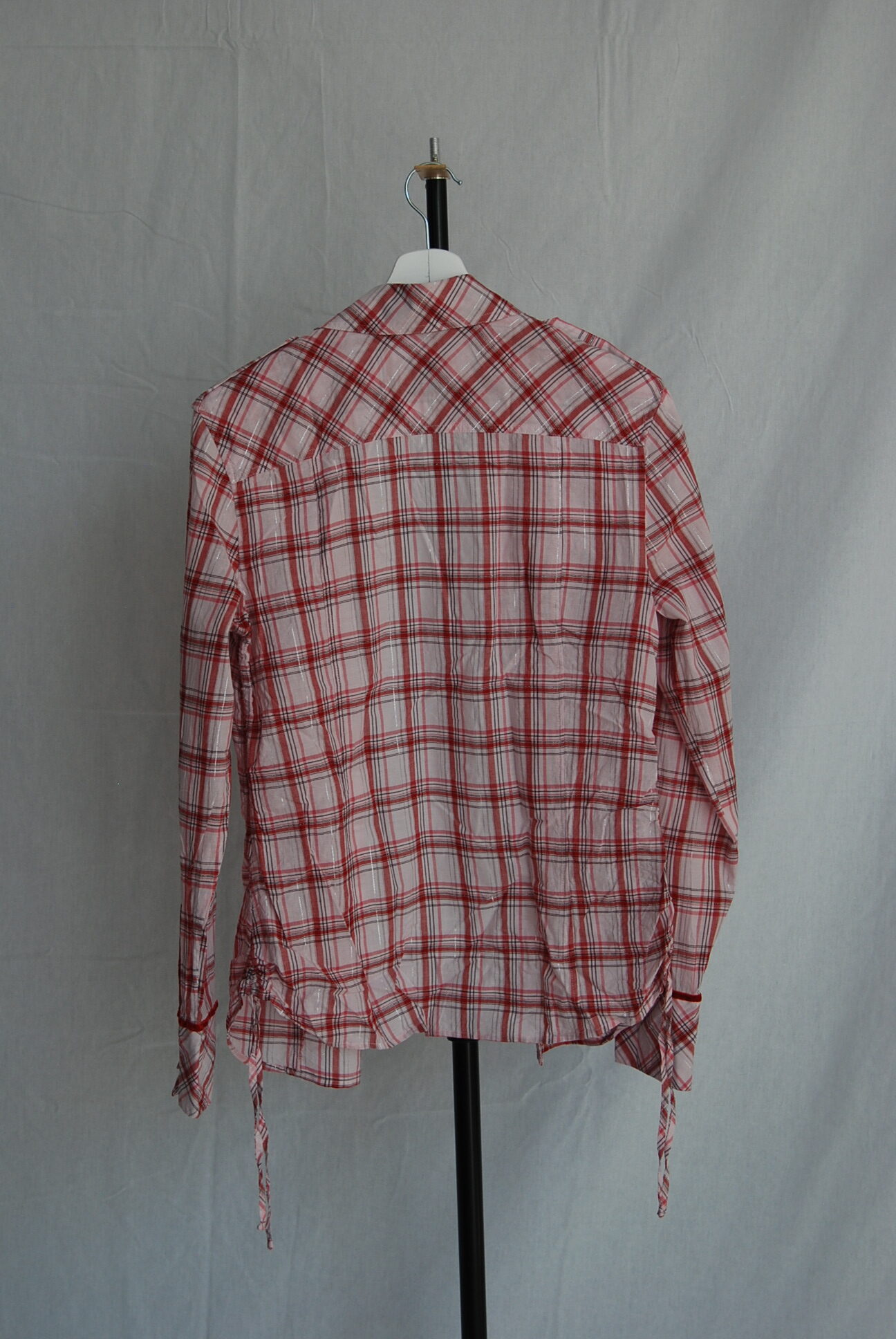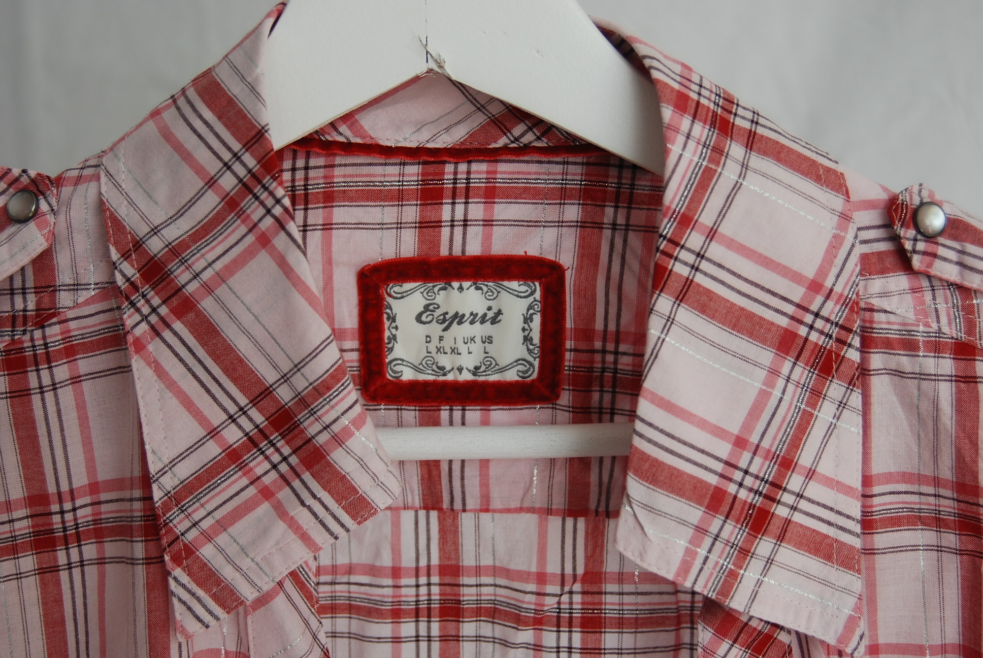 Rood/wit geruite blouse van het merk Esprit. Met lurexversiering. Lange mouwen. Druksluiting en touwversieringen aan beide zijden. Materiaal: 100% katoen.